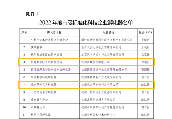 2022年度市级标准化科技企业孵化器
